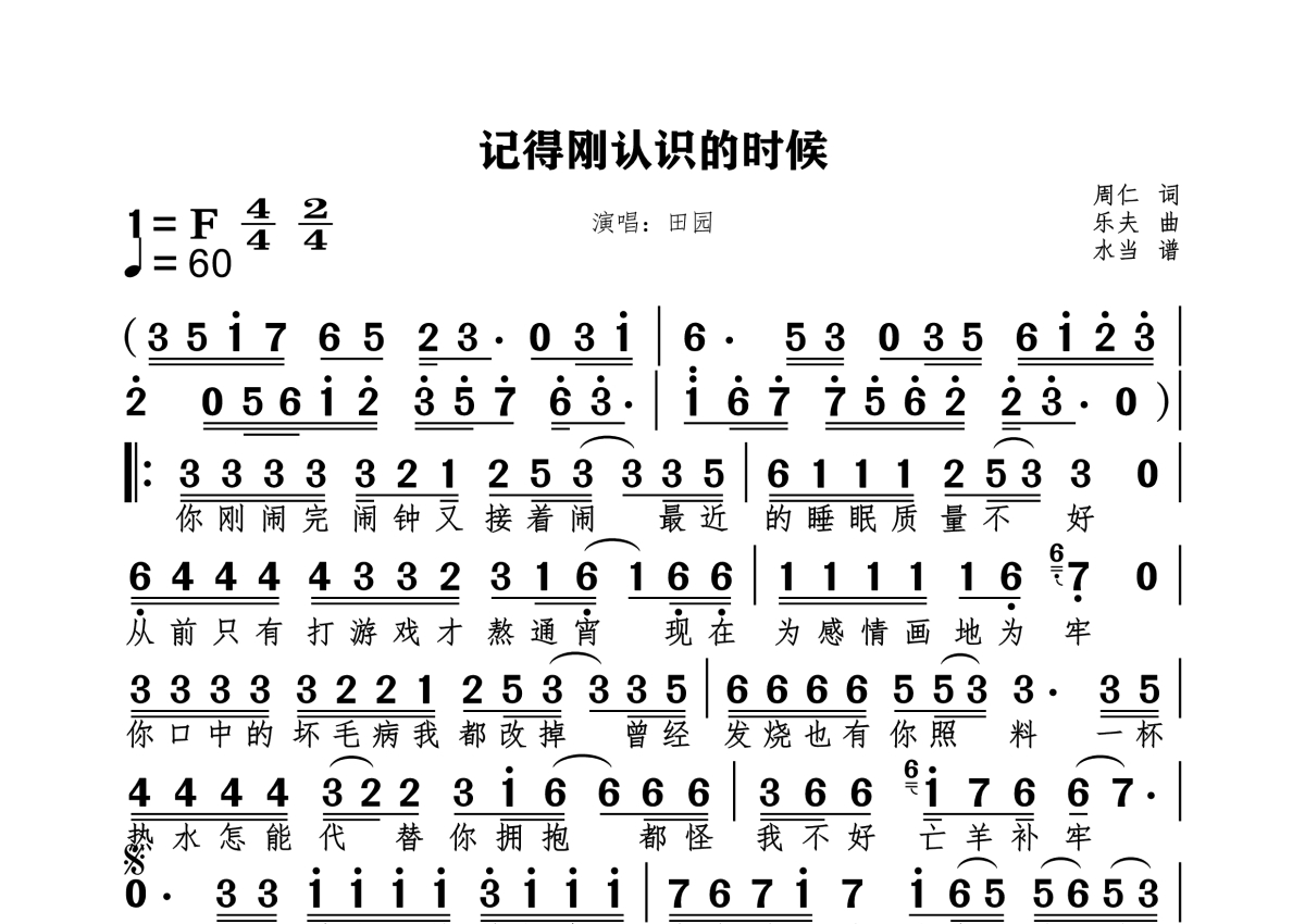 《记得刚认识的时候》是田园演唱的一首歌曲,拍号为4/4拍,这份简谱共有一张高清图谱,图谱由 @水当 编配上传。