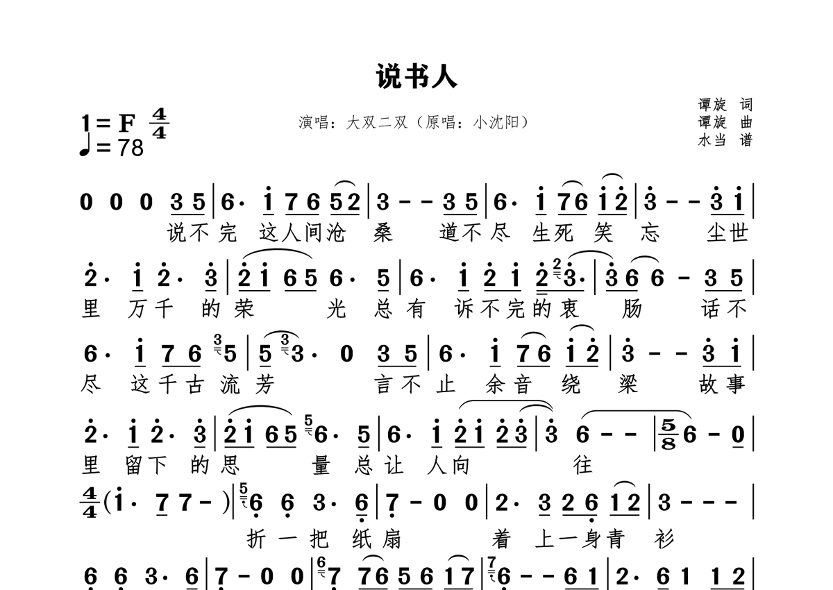 《说书人》是大双二双演唱的一首歌曲,拍号为4/4拍,这份简谱共有一张高清图谱,图谱由 @水当 编配上传。