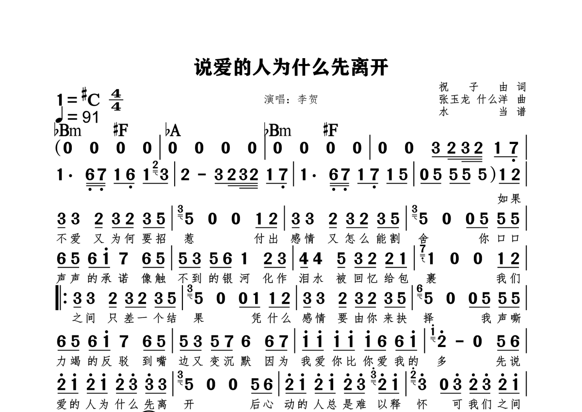 《说爱的人为什么先离开》是李贺演唱的一首歌曲,拍号为4/4拍,这份简谱共有一张高清图谱,图谱由 @水当 编配上传。