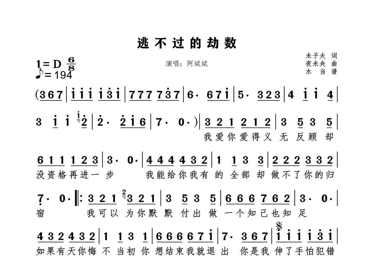 《逃不过的劫数》是阿斌斌演唱的一首歌曲,拍号为6/8拍,这份简谱共有一张高清图谱,图谱由 @水当 编配上传。