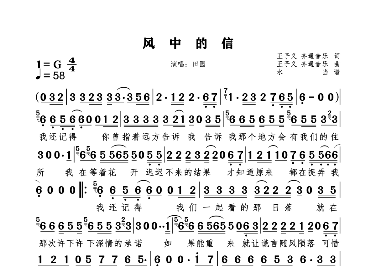 《风中的信》是田园演唱的一首歌曲,拍号为4/4拍,这份简谱共有一张高清图谱,图谱由 @水当 编配上传。