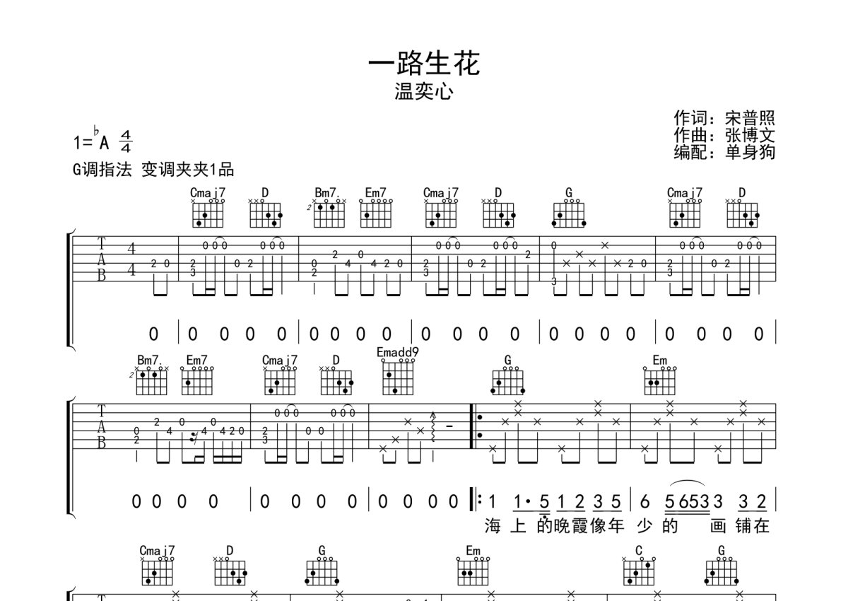 《一路生花》是温奕心演唱的一首歌曲,本吉他谱采用的是G调指法编配,这份吉他谱共有三张高清图谱,图谱由 @单身狗 编配上传,图谱使用六线谱编配,包含吉他和弦指法、简谱以及歌词部分,使用这份一路生花吉他谱,可以让你更加方便地掌握这首歌曲的弹唱技巧,快来尝试吧。温奕心《一路生花》吉他弹唱谱,采用G调指法编配,单身狗编配出品,共有3张高清图谱。