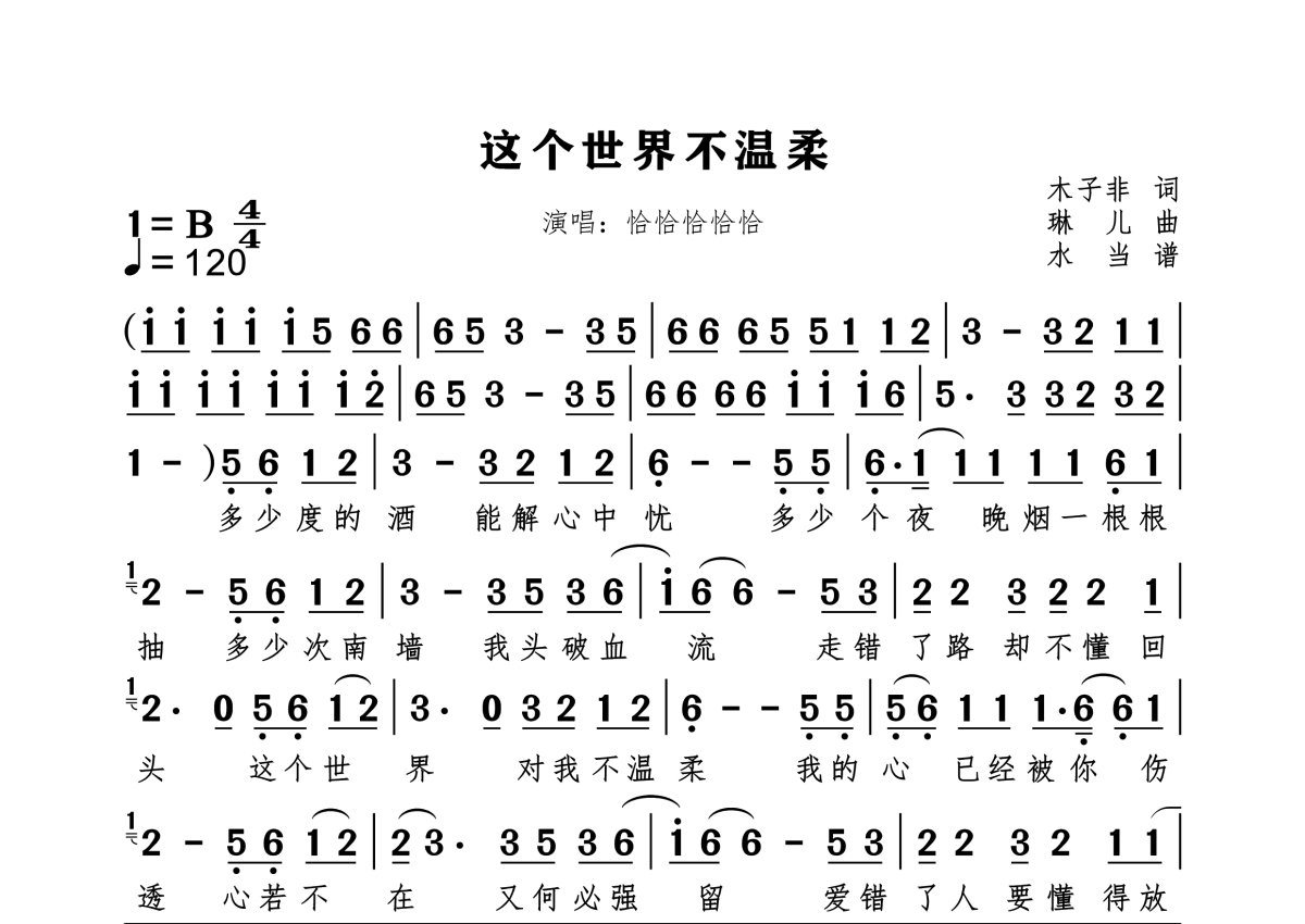 《这个世界不温柔》是恰恰恰恰恰演唱的一首歌曲,拍号为4/4拍,歌曲速度为每分钟120拍,这份简谱共有一张高清图谱,图谱由 @水当 编配上传原调B。