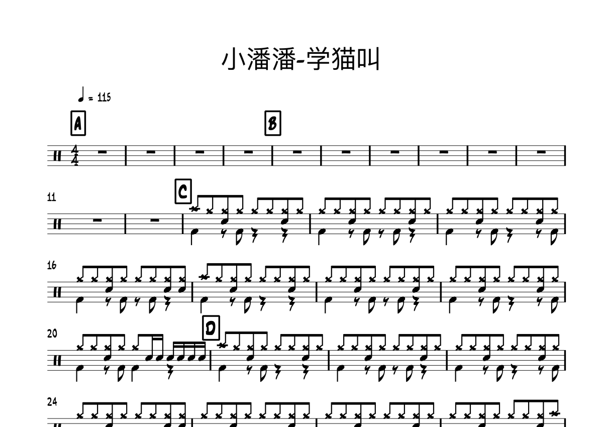 《学猫叫》是小潘潘演唱的一首歌曲,拍号为4/4拍,歌曲速度为每分钟115拍,这份架子鼓谱共有两张高清图谱,图谱由 @音符喷血者 编配上传,图谱使用五线谱编配,使用这份学猫叫架子鼓谱,你将能够轻松地敲打出这首小潘潘的学猫叫,快来尝试吧。