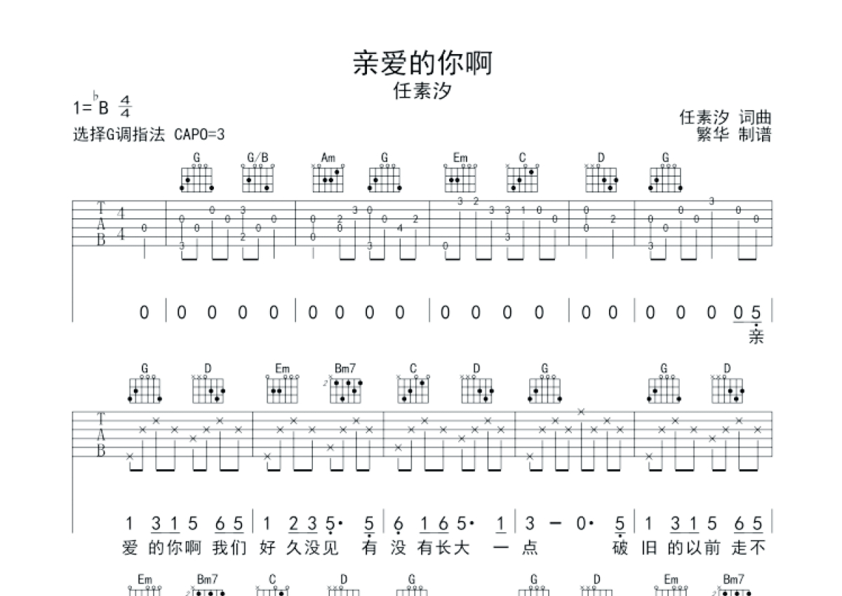 《亲爱的你啊》是任素汐演唱的一首歌曲,拍号为4/4拍,歌曲速度为每分钟75拍,歌曲原调为Bb调,但由于原调指法比较难,为了方便弹奏,本吉他谱采用的是G调指法编配,变调夹3品弹奏即为原调,当然也可以根据自己的音域改变变调夹位置,或者通过改变和弦调性,以方便自己弹奏,这份吉他谱共有三张高清图谱,图谱由 @繁华 编配上传,图谱使用六线谱编配,包含吉他和弦指法、简谱以及歌词部分,使用这份亲爱的你啊吉他谱,可以让你更加方便地掌握这首歌曲的弹唱技巧,快来尝试吧。亲爱的你啊吉他谱,选用G调指法,变调夹夹三品!。