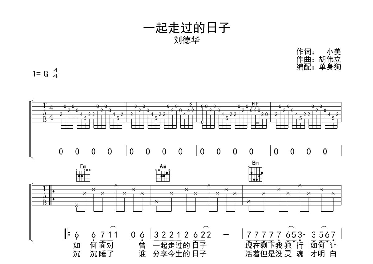 《一起走过的日子》是刘德华演唱的一首歌曲,本吉他谱采用的是G调指法编配,这份吉他谱共有三张高清图谱,图谱由 @单身狗 编配上传,图谱使用六线谱编配,包含吉他和弦指法、简谱以及歌词部分,使用这份一起走过的日子吉他谱,可以让你更加方便地掌握这首歌曲的弹唱技巧,快来尝试吧。刘德华《一起走过的日子》吉他弹唱谱,采用G调指法编配,单身狗编配出品,共有3张高清图谱。
