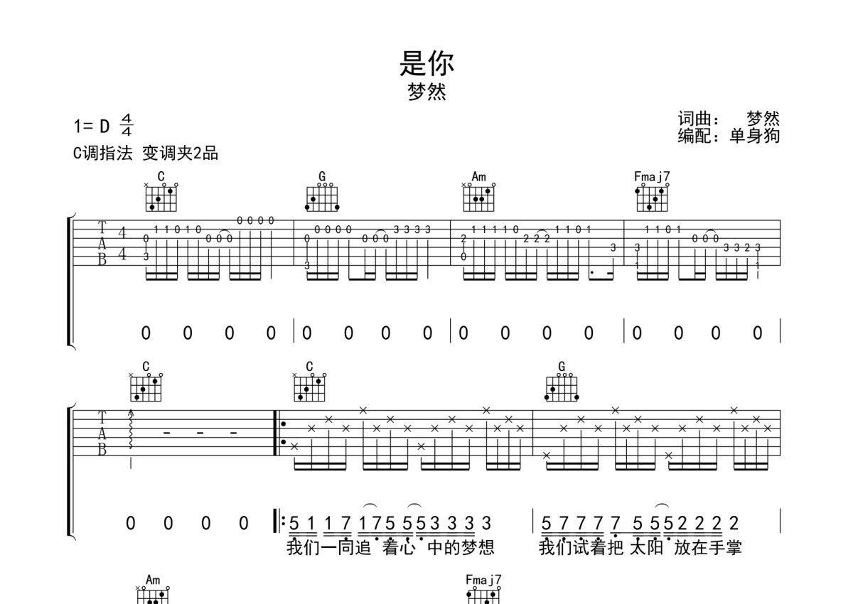 梦然《是你》吉他谱 - C调弹唱六线谱