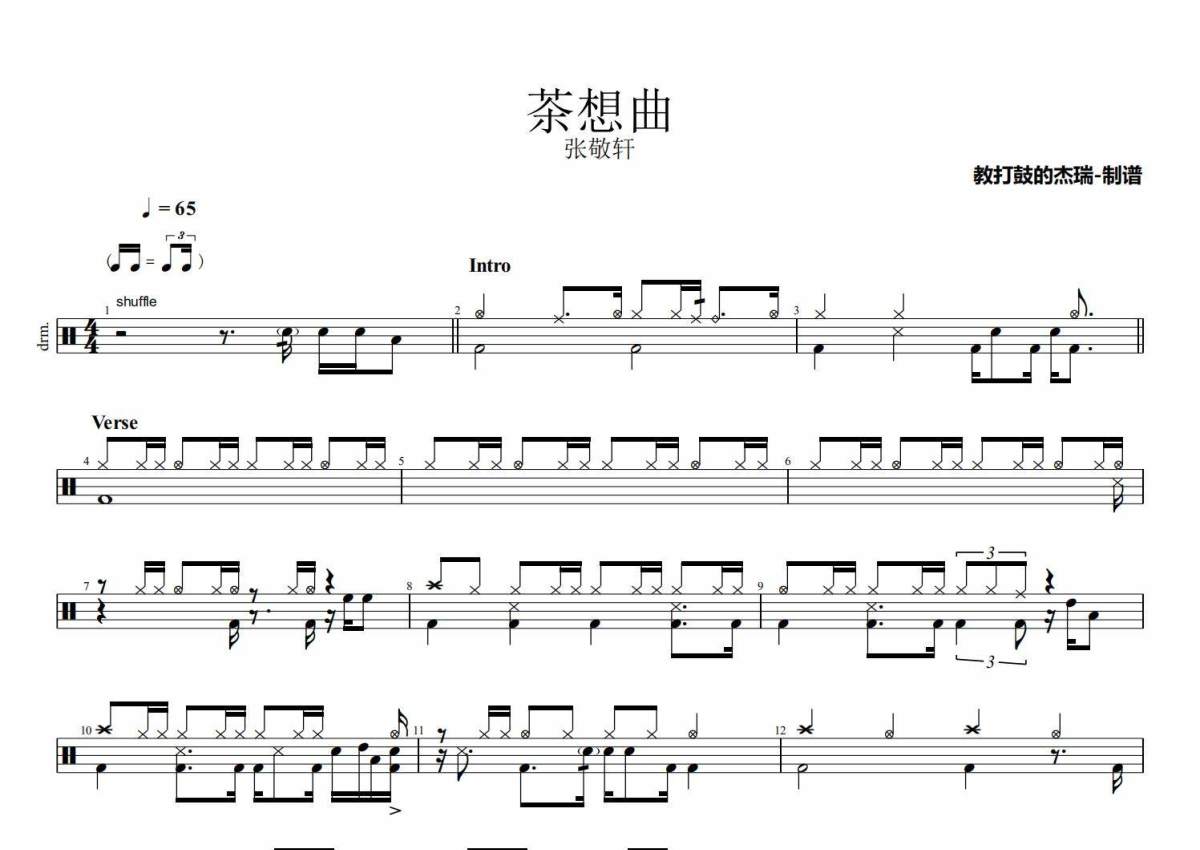 《茶想曲》是张敬轩演唱的一首歌曲,拍号为4/4拍,歌曲速度为每分钟65拍,这份架子鼓谱共有三张高清图谱,图谱由 @Jerry 编配上传,图谱使用五线谱编配,使用这份茶想曲架子鼓谱,你将能够轻松地敲打出这首张敬轩的茶想曲,快来尝试吧。