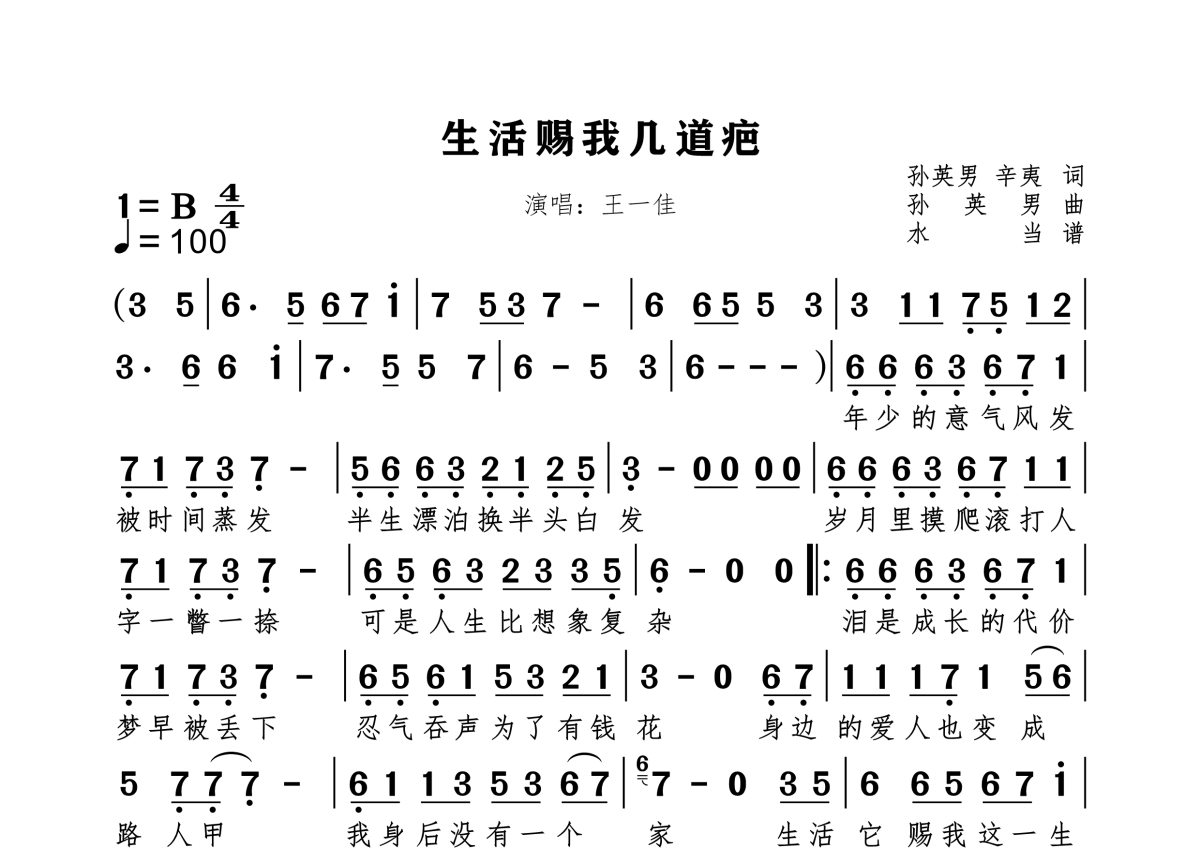 《生活赐我几道疤》是王一佳演唱的一首歌曲,拍号为4/4拍,歌曲速度为每分钟100拍,这份简谱共有一张高清图谱,图谱由 @水当 编配上传原调B。