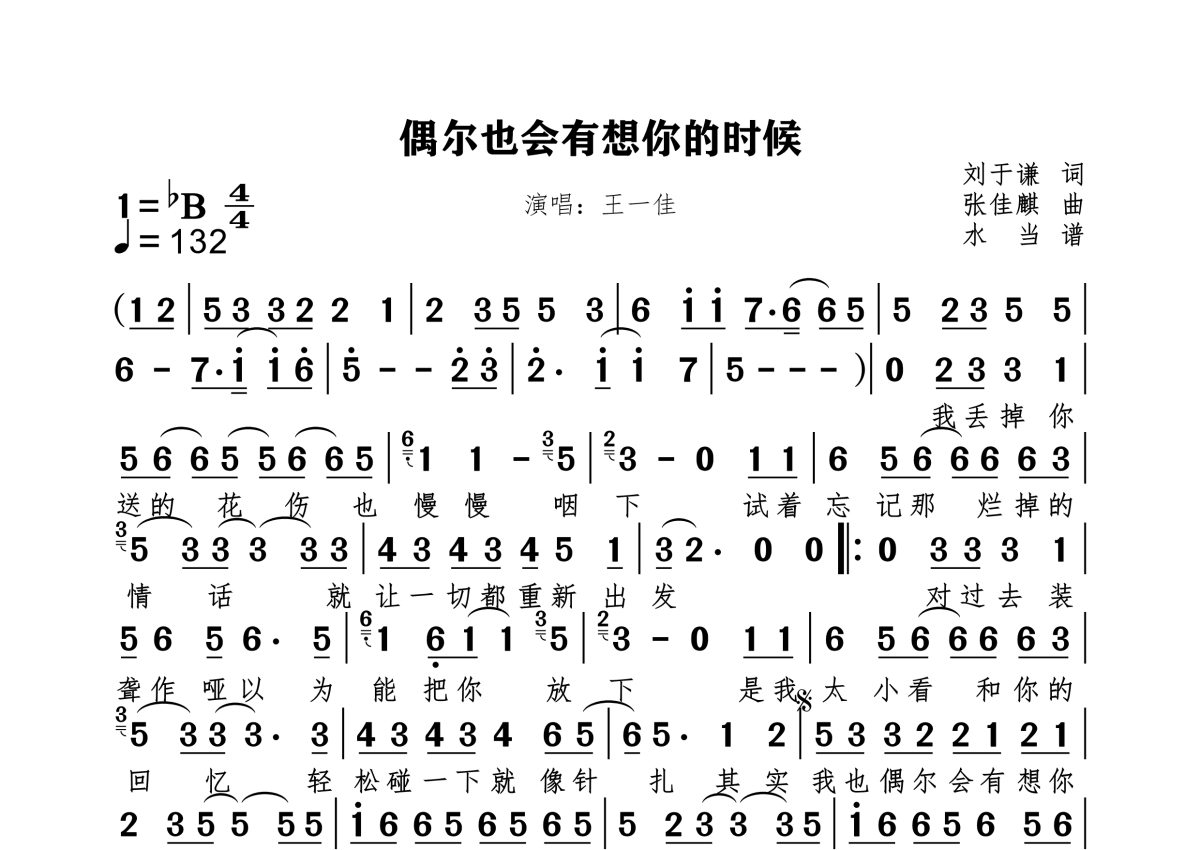 《偶尔也会有想你的时候》是王一佳演唱的一首歌曲,拍号为4/4拍,歌曲速度为每分钟132拍,这份简谱共有一张高清图谱,图谱由 @水当 编配上传原调bB。