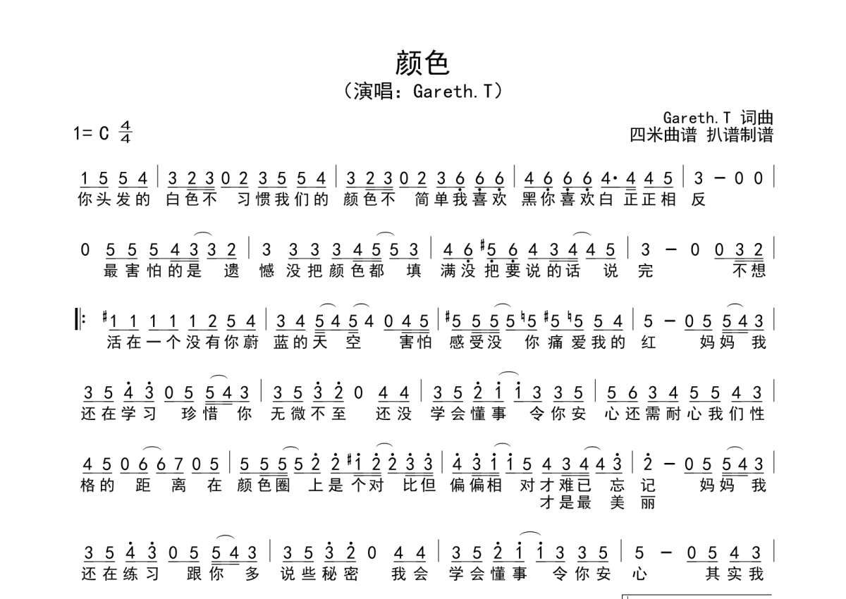 《颜色》是Gareth.T演唱的一首歌曲,拍号为4/4拍,这份简谱共有一张高清图谱,图谱由 @SRV7758521 编配上传。
