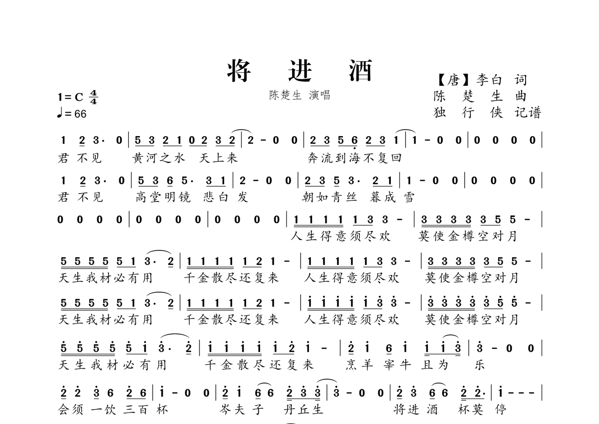 《将进酒》是陈楚生演唱的一首歌曲,拍号为4/4拍,歌曲速度为每分钟66拍,这份简谱共有一张高清图谱,图谱由 @独行侠 编配上传。