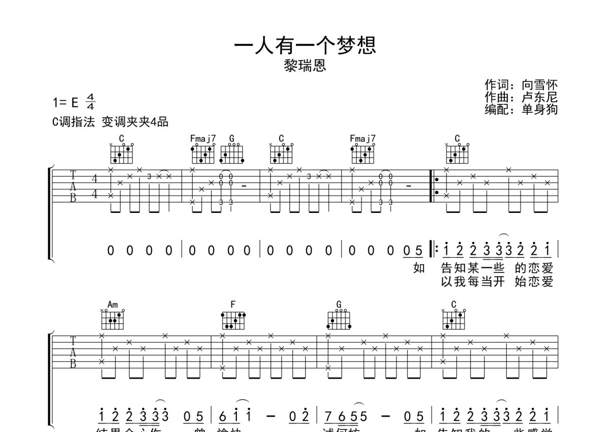 黎瑞恩《一人有一个梦想》吉他谱 - C调弹唱六线谱