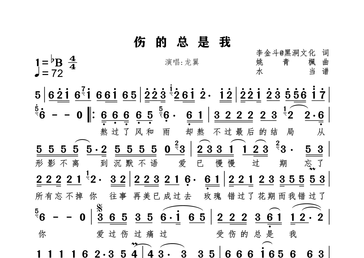 《伤的总是我》是龙翼演唱的一首歌曲,拍号为4/4拍,歌曲速度为每分钟72拍,这份简谱共有一张高清图谱,图谱由 @水当 编配上传原调bB。