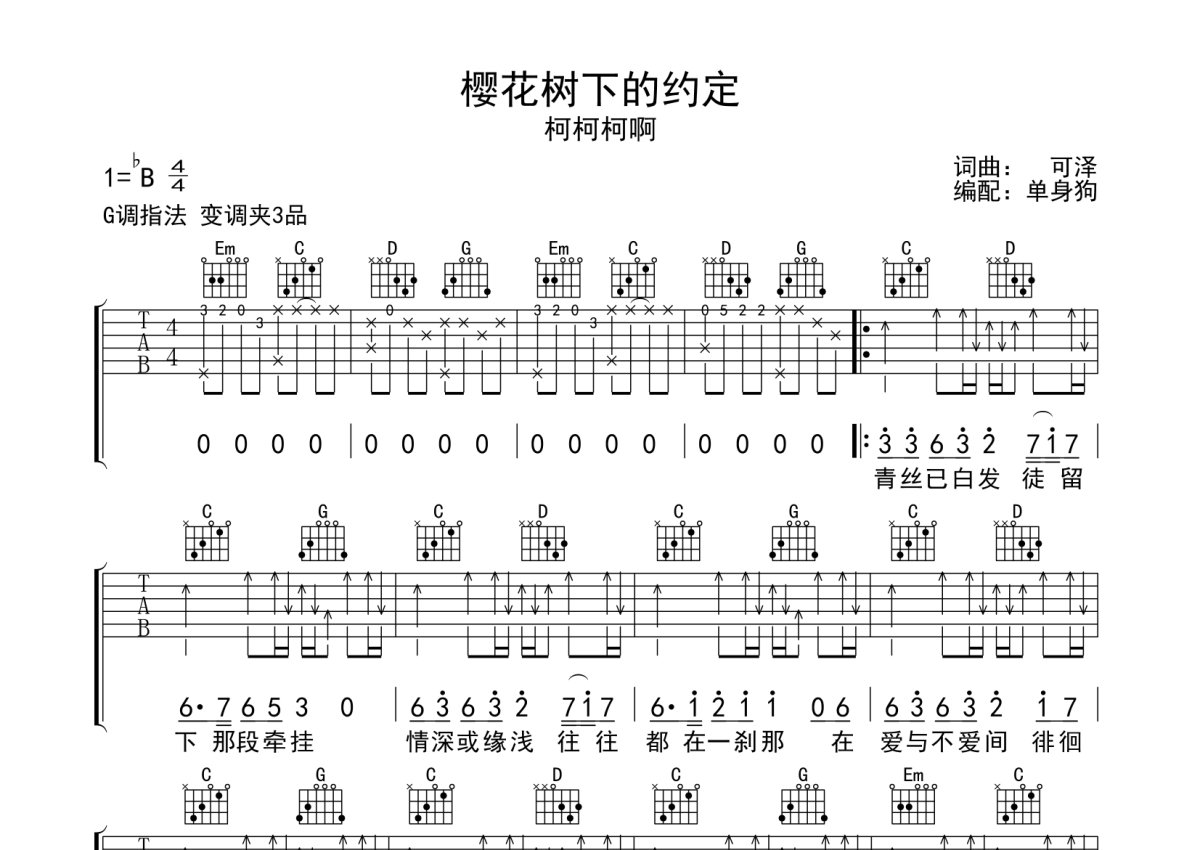 柯柯柯啊《樱花树下的约定》吉他谱 - G调弹唱六线谱