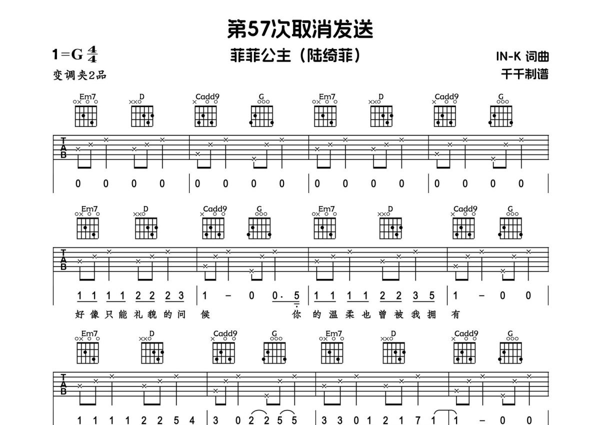《第57次取消发送》是菲菲公主(陆绮菲)演唱的一首歌曲,拍号为4/4拍,歌曲原调为A调,但由于原调指法比较难,为了方便弹奏,本吉他谱采用的是G调指法编配,变调夹2品弹奏即为原调,当然也可以根据自己的音域改变变调夹位置,或者通过改变和弦调性,以方便自己弹奏,这份吉他谱共有两张高清图谱,图谱由 @千千 编配上传,图谱使用六线谱编配,包含吉他和弦指法、简谱以及歌词部分,使用这份第57次取消发送吉他谱,可以让你更加方便地掌握这首歌曲的弹唱技巧,快来尝试吧。
