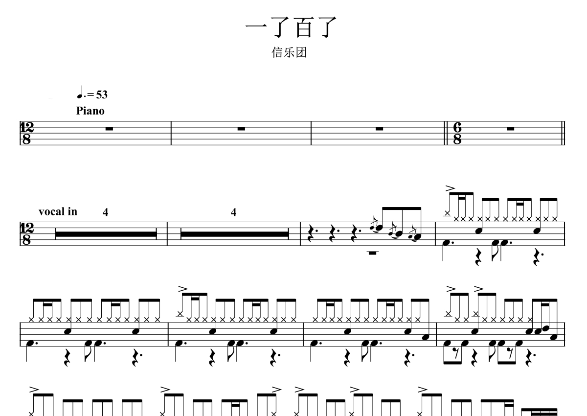 《一了百了》是信乐团演唱的一首歌曲,拍号为4/4拍,歌曲速度为每分钟53拍,这份架子鼓谱共有两张高清图谱,图谱由 @音符喷血者 编配上传,图谱使用五线谱编配,使用这份一了百了架子鼓谱,你将能够轻松地敲打出这首信乐团的一了百了,快来尝试吧。
