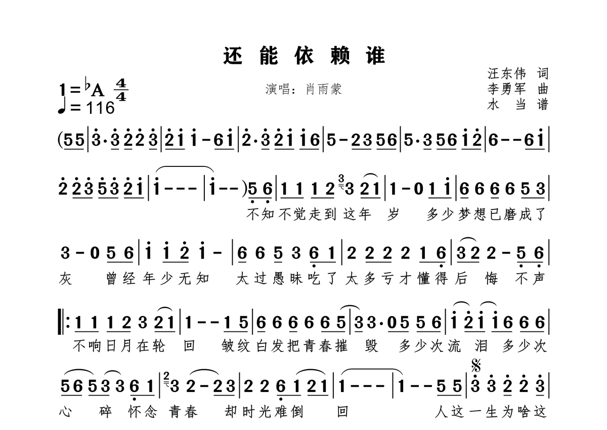 《还能依赖谁》是肖雨蒙演唱的一首歌曲,拍号为4/4拍,歌曲速度为每分钟116拍,这份简谱共有一张高清图谱,图谱由 @水当 编配上传原调bA。