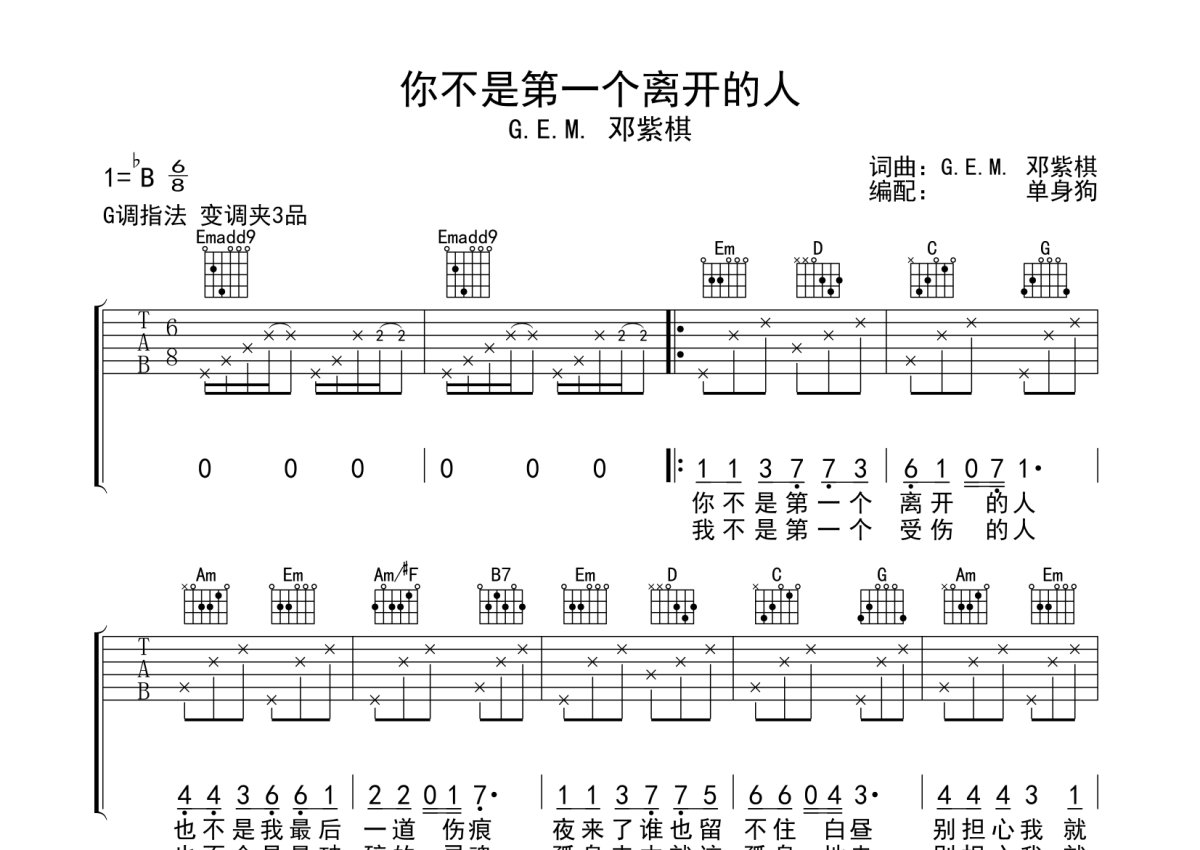 《你不是第一个离开的人》是邓紫棋演唱的一首歌曲,本吉他谱采用的是G调指法编配,这份吉他谱共有两张高清图谱,图谱由 @单身狗 编配上传,图谱使用六线谱编配,包含吉他和弦指法、简谱以及歌词部分,使用这份你不是第一个离开的人吉他谱,可以让你更加方便地掌握这首歌曲的弹唱技巧,快来尝试吧。邓紫棋《你不是第一个离开的人》吉他弹唱谱,采用G调指法编配,单身狗编配出品,共有2张高清图谱,免翻页排版设计。