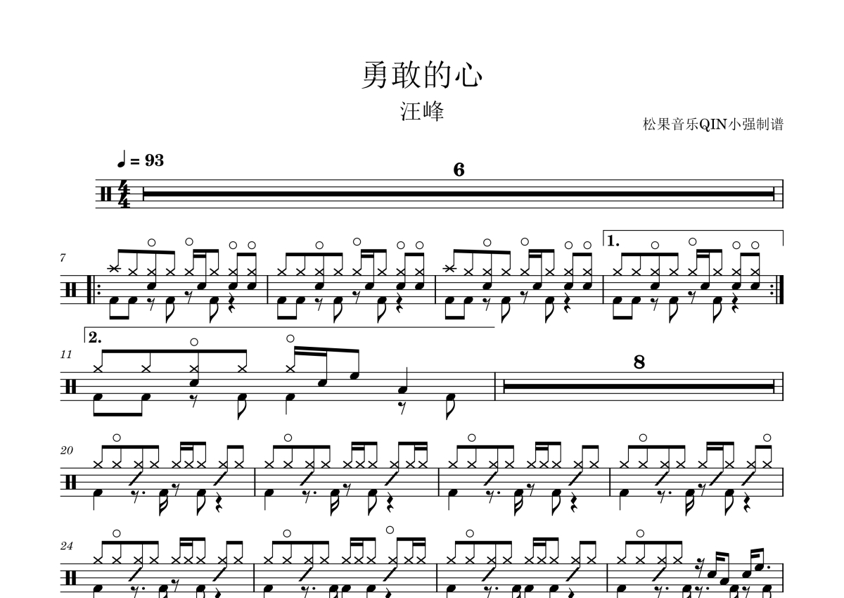 《勇敢的心》是汪峰演唱的一首歌曲,拍号为4/4拍,这份架子鼓谱共有两张高清图谱,图谱由 @松果音乐QIN小强 编配上传,图谱使用五线谱编配,使用这份勇敢的心架子鼓谱,你将能够轻松地敲打出这首汪峰的勇敢的心,快来尝试吧。《勇敢的心》是由汪峰创作并演唱的歌曲,收录在2007年6月1日发行的专辑《勇敢的心》中。2008年3月29日,汪峰凭借该曲获第十五届东方风云榜最佳作词奖。