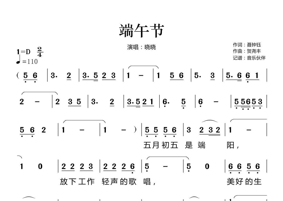 《端午节》是晓晓演唱的一首歌曲,拍号为2/4拍,歌曲速度为每分钟110拍,这份简谱共有两张高清图谱,图谱由 @音乐伙伴 编配上传。