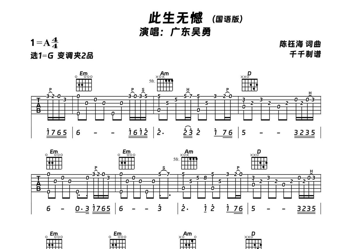 广东吴勇《此生无憾》吉他谱 - G调弹唱六线谱