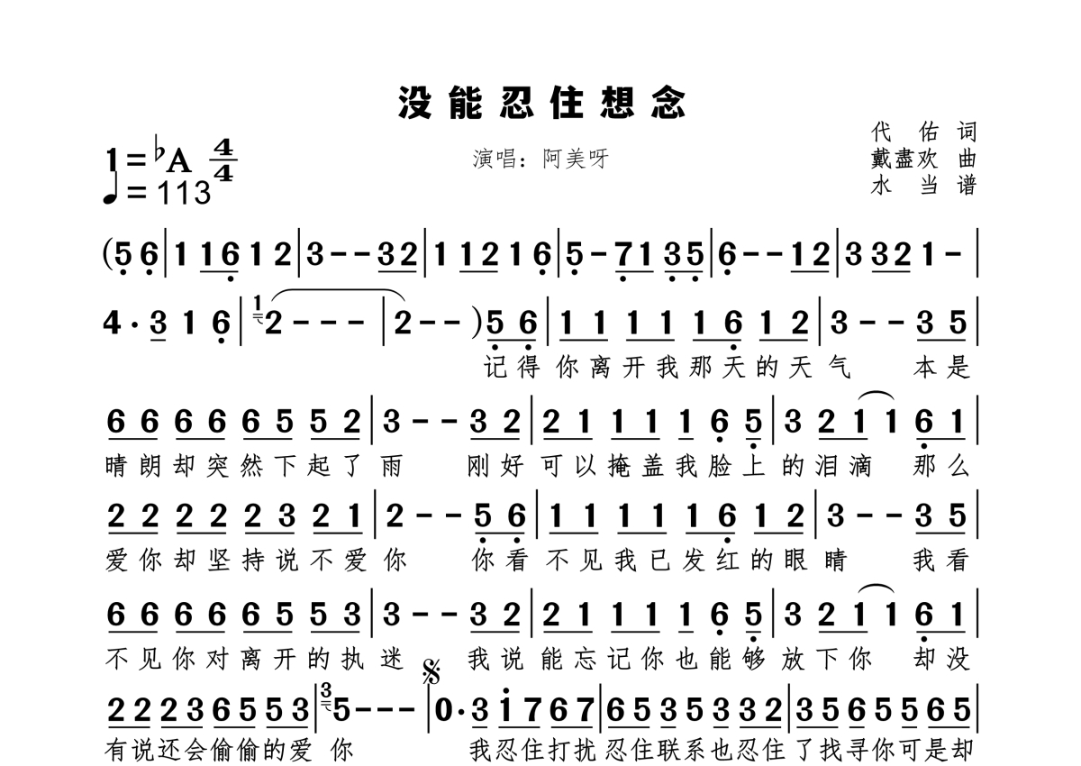 《没能忍住想念》是阿美呀演唱的一首歌曲,拍号为4/4拍,歌曲速度为每分钟113拍,这份简谱共有一张高清图谱,图谱由 @水当 编配上传原调bA。