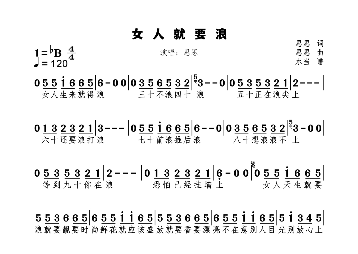 《女人就要浪》是思思演唱的一首歌曲,拍号为4/4拍,歌曲速度为每分钟120拍,这份简谱共有一张高清图谱,图谱由 @水当 编配上传原调bB。