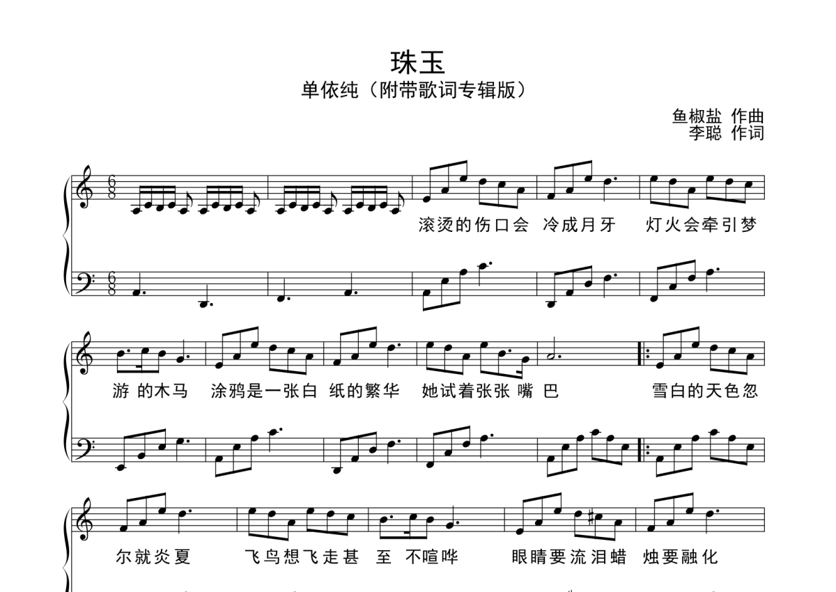 《珠玉》是单依纯演唱的一首歌曲,C调五线谱,拍号为6/8拍,歌曲速度为每分钟100拍,这份钢琴谱共有两张高清图谱,图谱由 @农村弹唱王 编配上传,曲谱配备了相关的音频提供试听,使用这份珠玉钢琴谱,可以让你更加方便地掌握这首歌曲的演奏技巧,快来尝试吧。