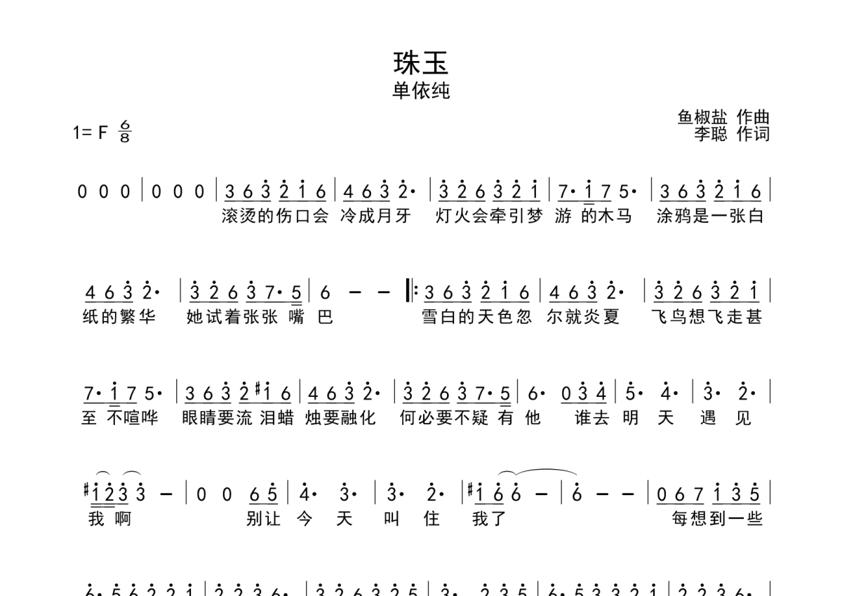 《珠玉》是单依纯演唱的一首歌曲,专辑版,拍号为6/8拍,歌曲速度为每分钟100拍,这份简谱共有一张高清图谱,图谱由 @师渡尘 编配上传。