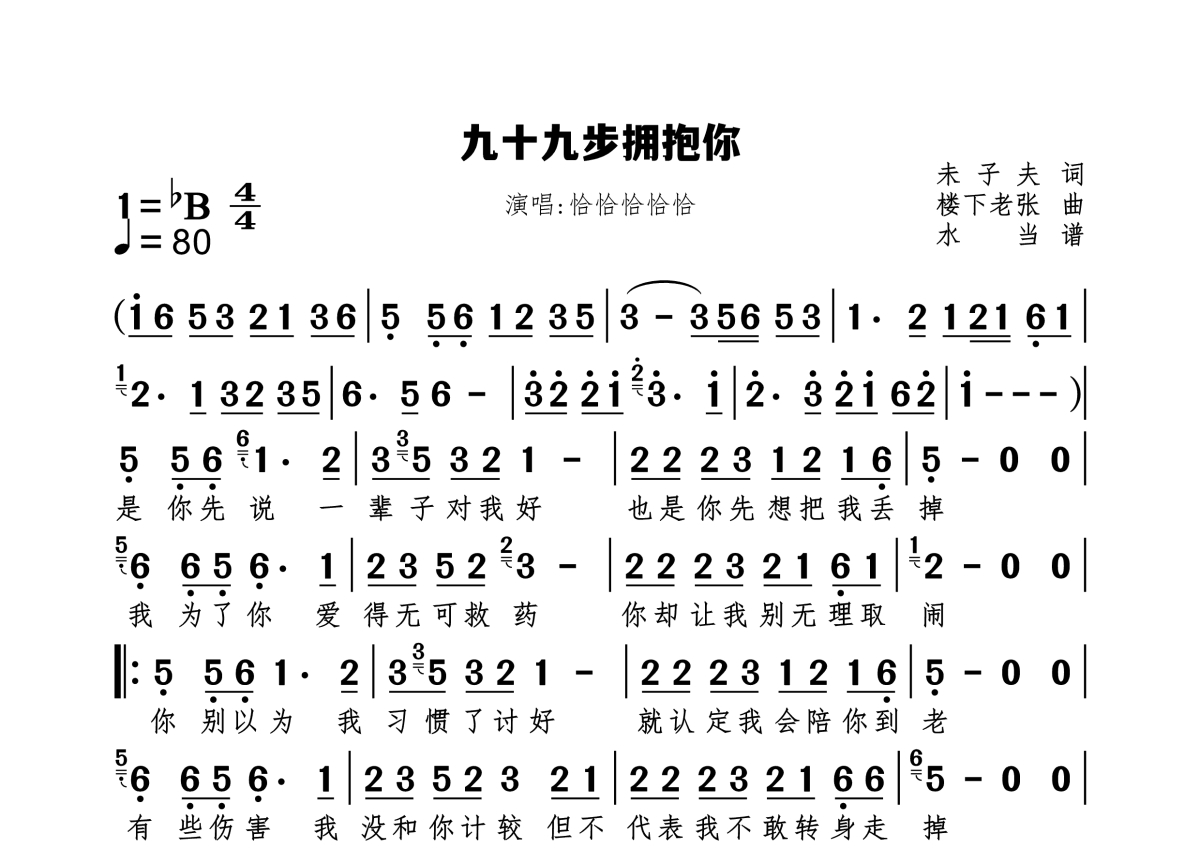 《九十九步拥抱你》是恰恰恰恰恰演唱的一首歌曲,这份简谱共有一张高清图谱,图谱由 @水当 编配上传原调bB。