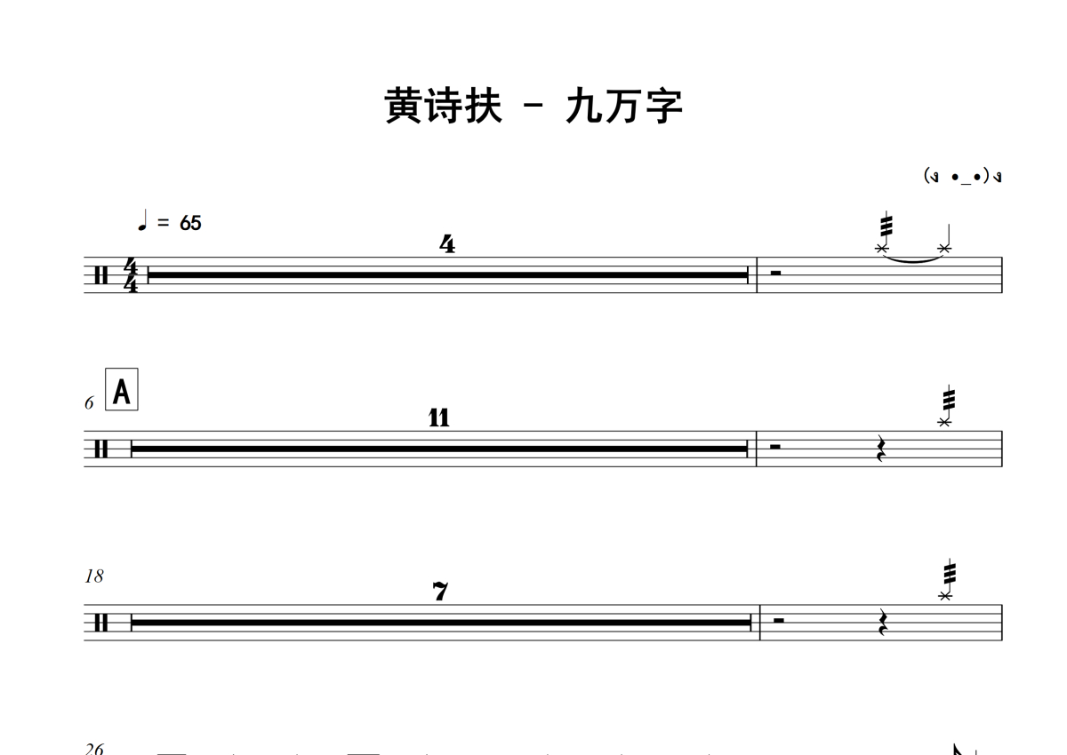 《九万字》是黄诗扶演唱的一首歌曲,拍号为4/4拍,歌曲速度为每分钟65拍,这份架子鼓谱共有两张高清图谱,图谱由 @老虎不说谎 编配上传,图谱使用五线谱编配,使用这份九万字架子鼓谱,你将能够轻松地敲打出这首黄诗扶的九万字,快来尝试吧。