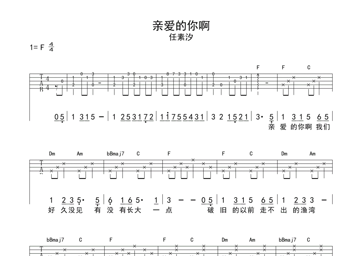 《亲爱的你啊》是任素汐演唱的一首歌曲,男女通用版,拍号为4/4拍,歌曲速度为每分钟68拍,歌曲原调为Bb调,但由于原调指法比较难,为了方便弹奏,本尤克里里谱采用的是F调指法编配,变调夹5品弹奏即为原调,当然也可以根据自己的音域改变变调夹位置,或者通过改变和弦调性,以方便自己弹奏,这份尤克里里谱共有三张高清图谱,图谱由 @师渡尘 编配上传,图谱使用四线谱编配,包含尤克里里和弦指法、简谱以及歌词部分,使用这份亲爱的你啊尤克里里谱,可以让你更加方便地掌握这首歌曲的弹唱技巧,快来尝试吧。本谱采用F调指法编配,男女通用,男生不夹品,女生夹五品。