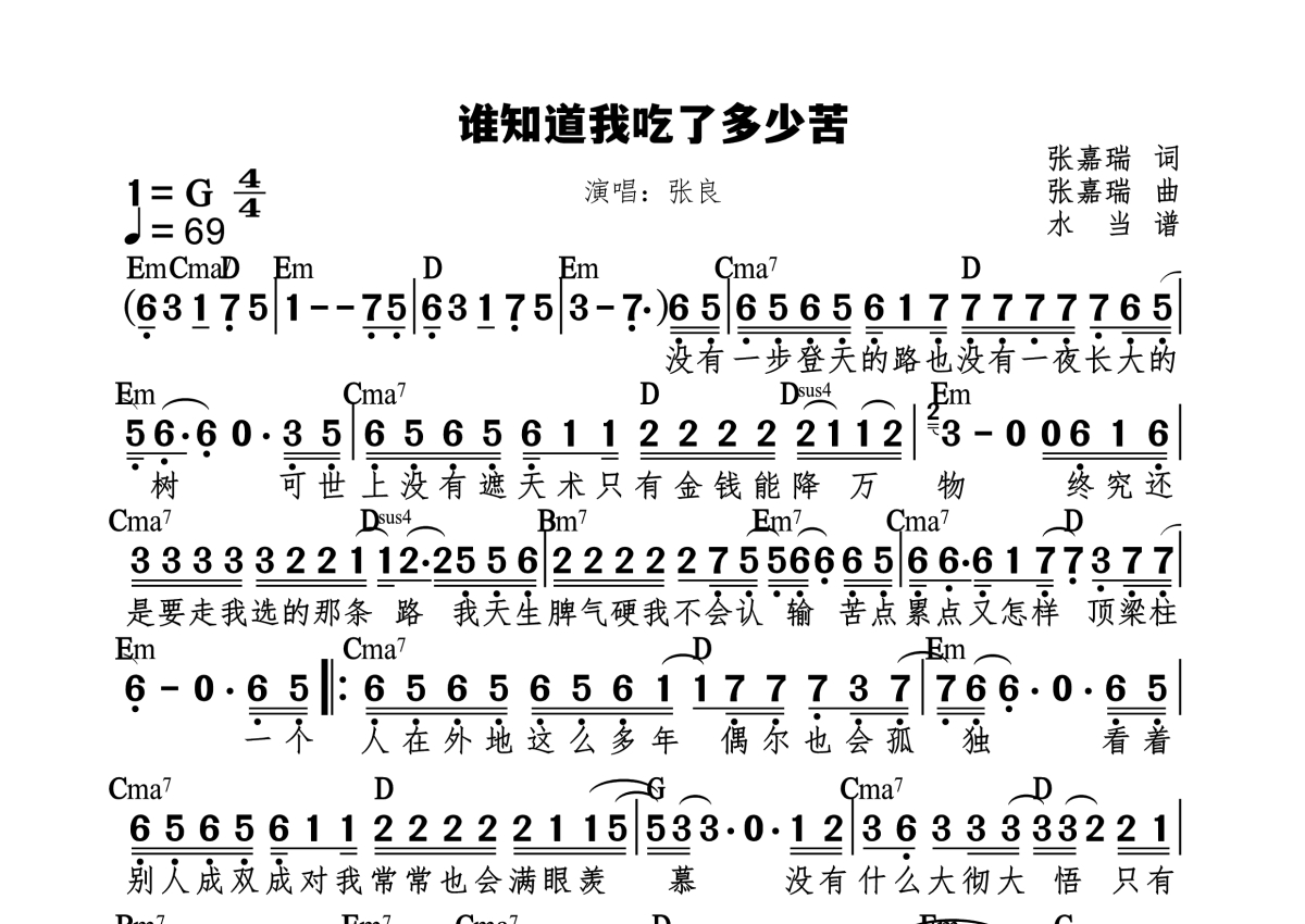 张良《谁知道我吃了多少苦》简谱 - 标和弦版