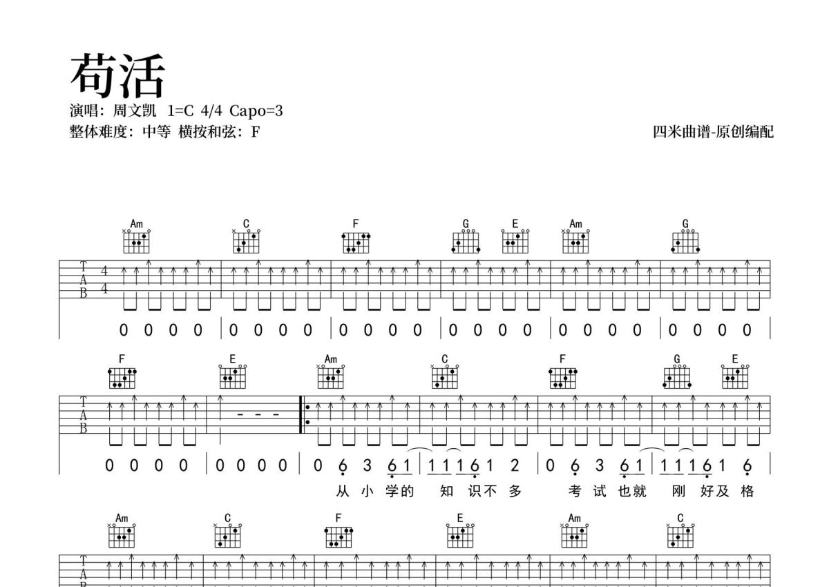 苟活吉他谱 - 周文凯演唱 - C调弹唱六线谱