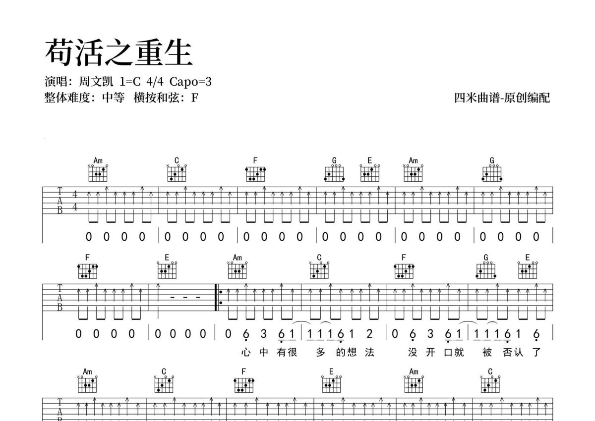 周文凯《苟活之重生》吉他谱 - C调弹唱六线谱