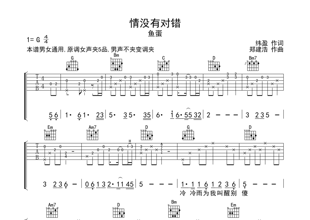鱼蛋《情没有对错》吉他谱 - G调弹唱六线谱 - 男女通用版