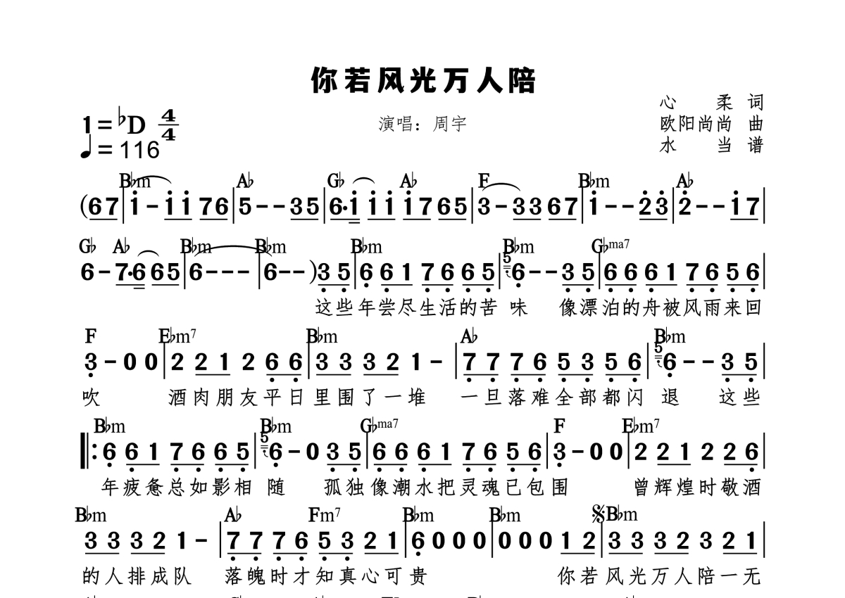 《你若风光万人陪》是周宇演唱的一首歌曲,标和弦版,拍号为4/4拍,歌曲速度为每分钟116拍,这份简谱共有一张高清图谱,图谱由 @水当 编配上传原调bD。