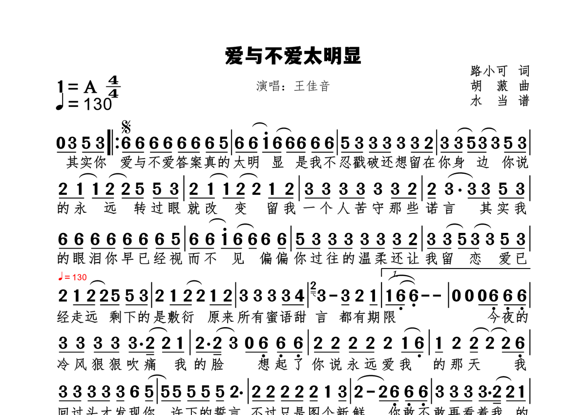 《爱与不爱太明显》是王佳音演唱的一首歌曲,拍号为4/4拍,歌曲速度为每分钟130拍,这份简谱共有一张高清图谱,图谱由 @水当 编配上传原调A。