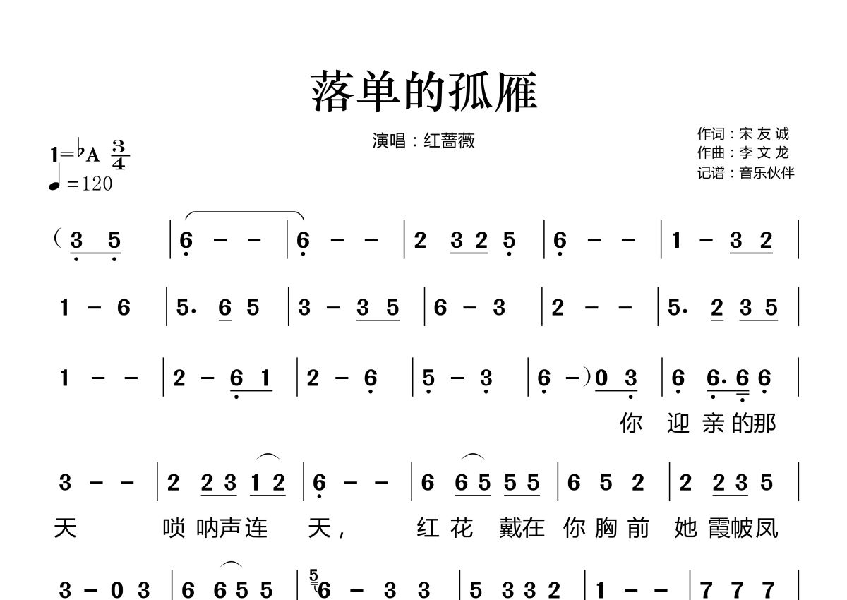 落单的孤雁简谱 - 红蔷薇演唱