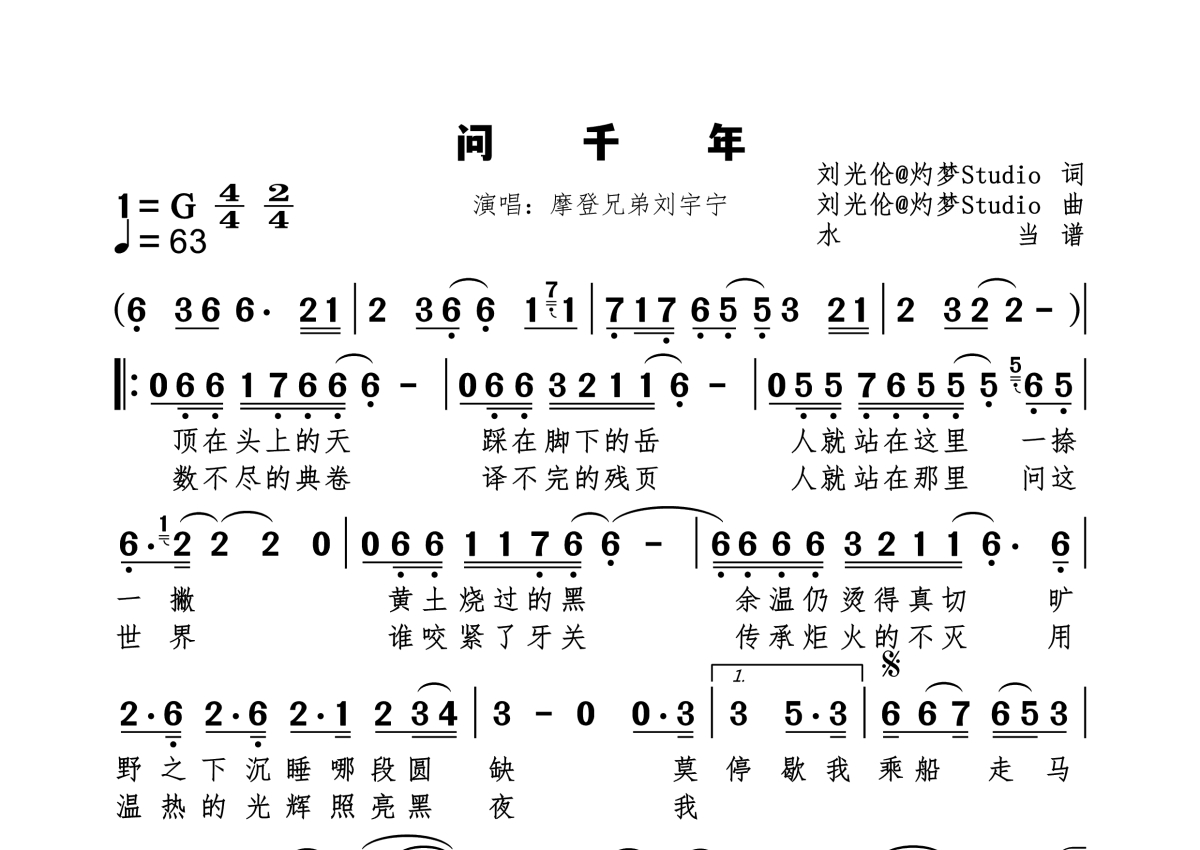 《问千年》是摩登兄弟刘宇宁演唱的一首歌曲,拍号为4/4拍,歌曲速度为每分钟63拍,这份简谱共有一张高清图谱,图谱由 @水当 编配上传原调G。