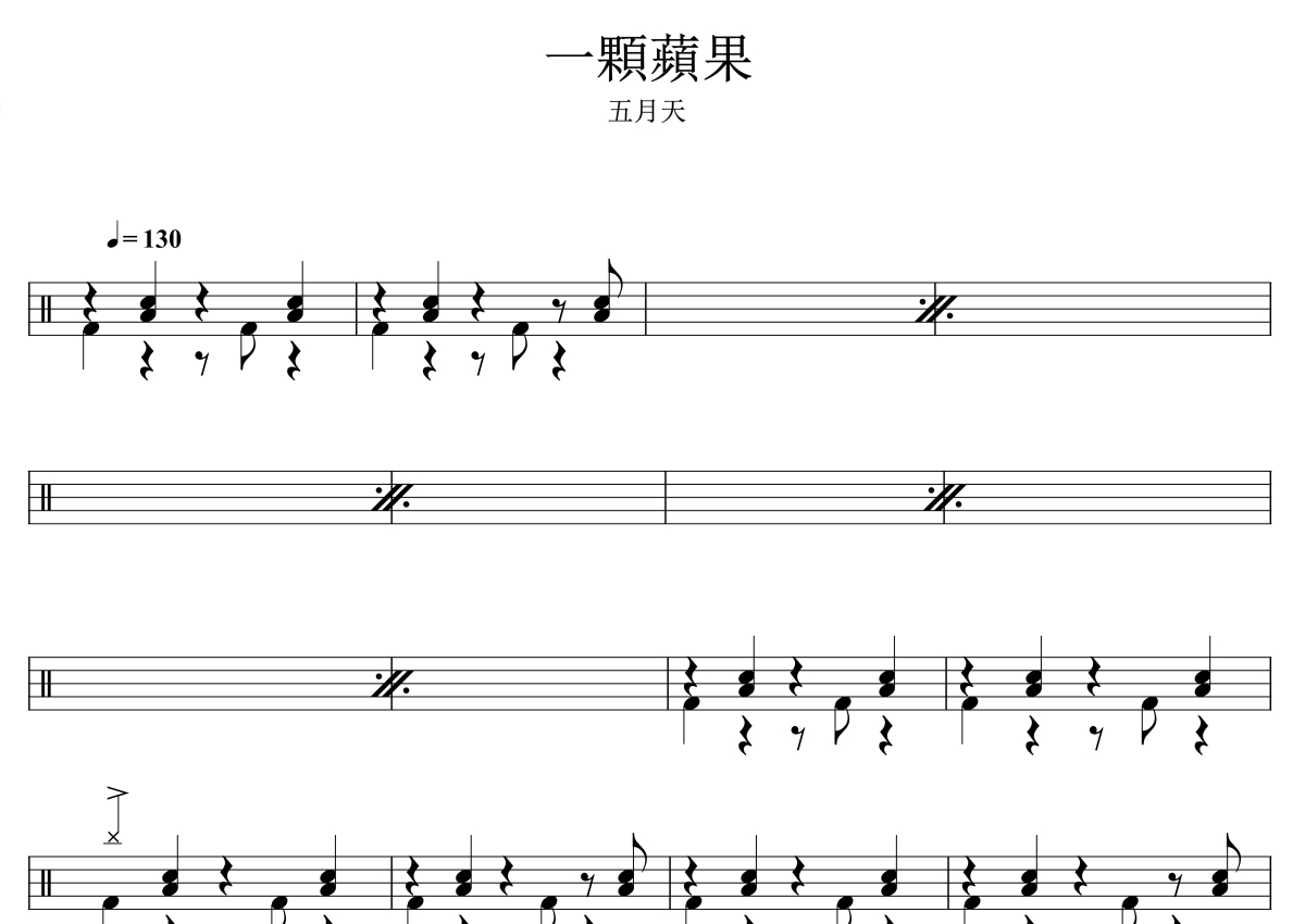 《一颗苹果》是五月天演唱的一首歌曲,拍号为4/4拍,歌曲速度为每分钟130拍,这份架子鼓谱共有三张高清图谱,图谱由 @音符喷血者 编配上传,图谱使用五线谱编配,使用这份一颗苹果架子鼓谱,你将能够轻松地敲打出这首五月天的一颗苹果,快来尝试吧。