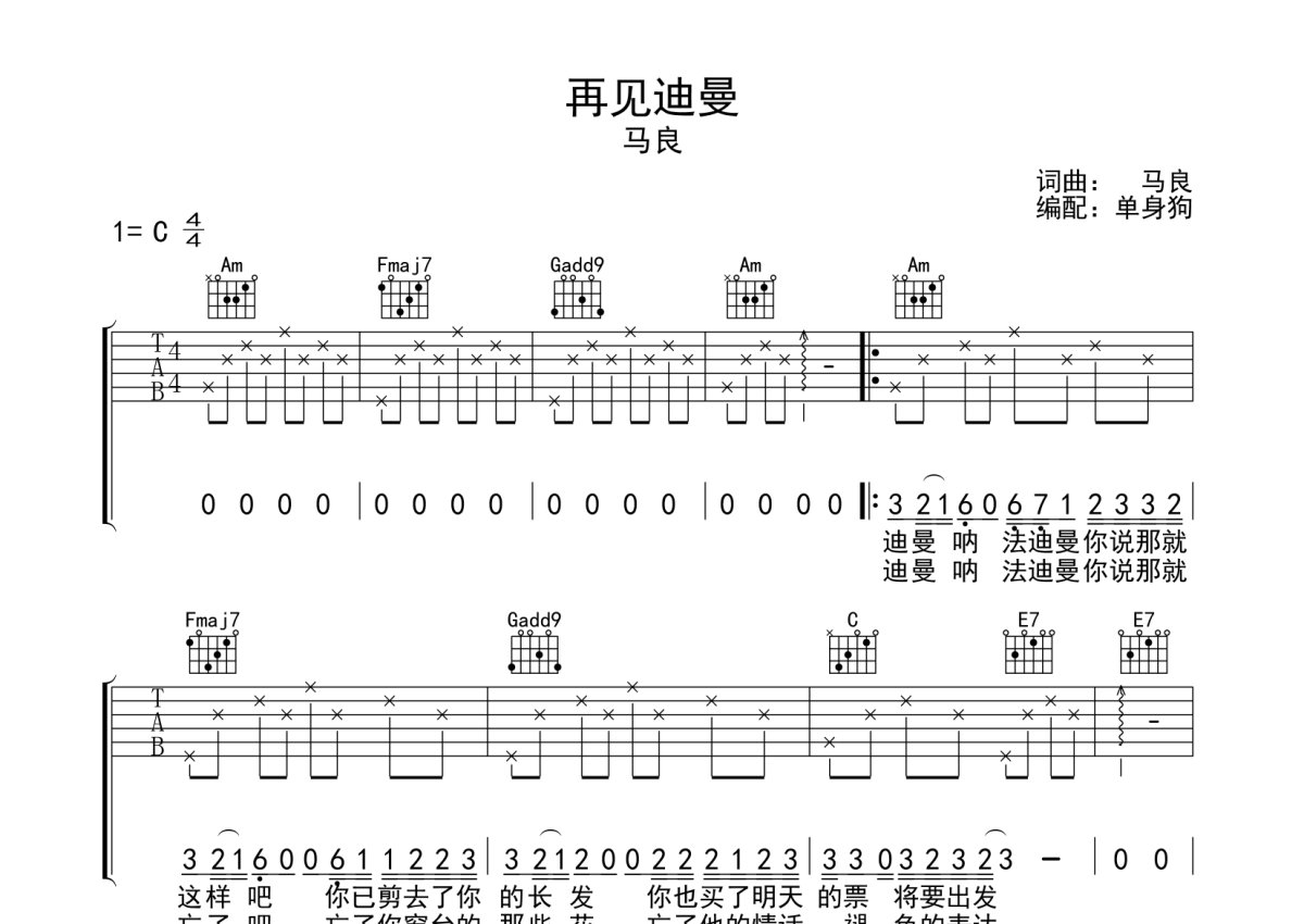 马良《再见迪曼》吉他谱 - C调弹唱六线谱