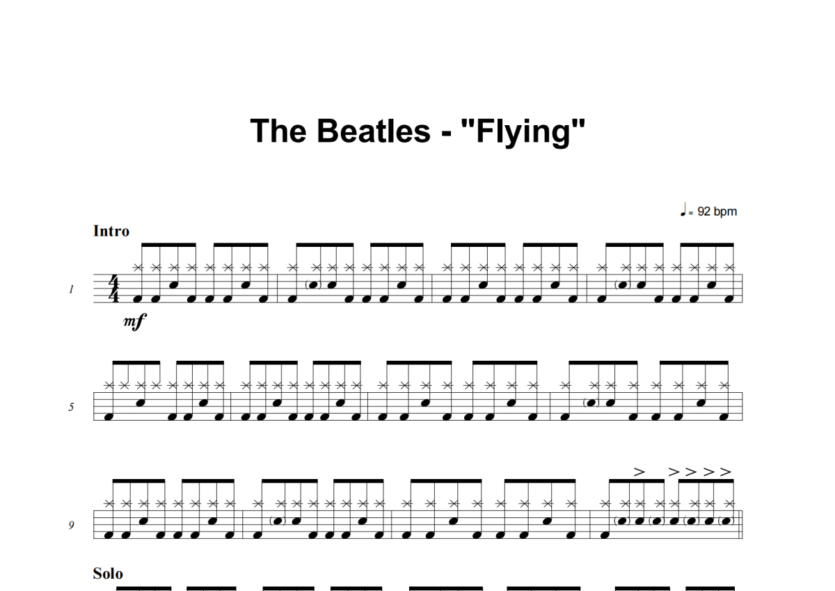 《Flying》是The Beatles演唱的一首歌曲,这份架子鼓谱共有两张高清图谱,图谱由 @老虎不说谎 编配上传,图谱使用五线谱编配,使用这份Flying架子鼓谱,你将能够轻松地敲打出这首The Beatles的Flying,快来尝试吧。