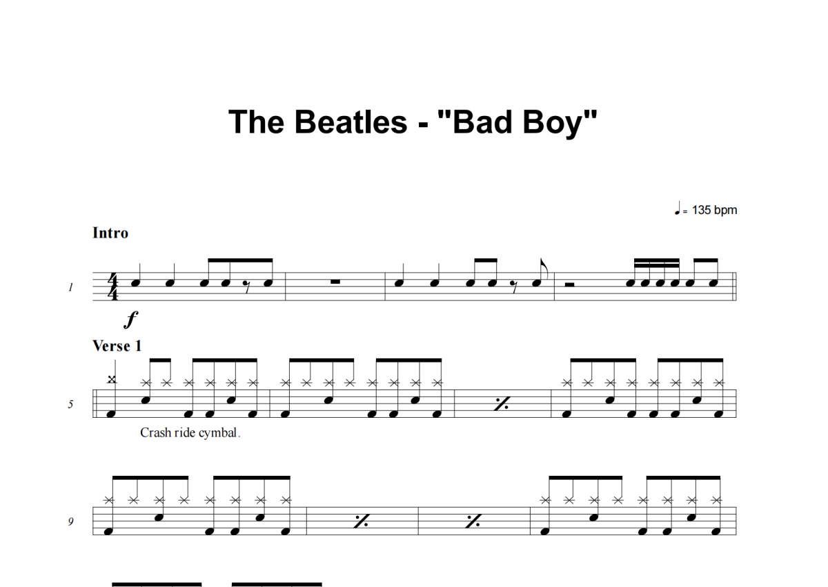 《Bad Boy》是The Beatles演唱的一首歌曲,这份架子鼓谱共有三张高清图谱,图谱由 @积极处世 编配上传,图谱使用五线谱编配,使用这份Bad Boy架子鼓谱,你将能够轻松地敲打出这首The Beatles的Bad Boy,快来尝试吧。