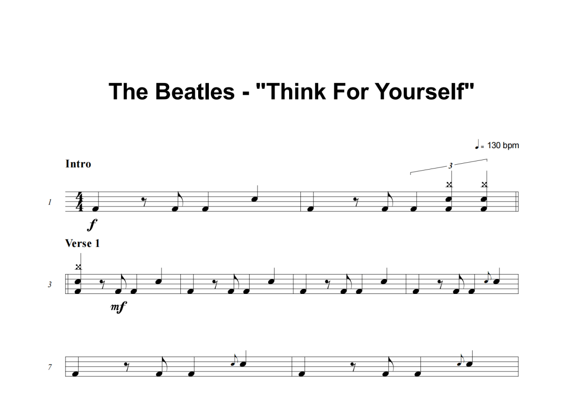 《Think For Yourself》是The Beatles演唱的一首歌曲,这份架子鼓谱共有三张高清图谱,图谱由 @积极处世 编配上传,图谱使用五线谱编配,使用这份Think For Yourself架子鼓谱,你将能够轻松地敲打出这首The Beatles的Think For Yourself,快来尝试吧。