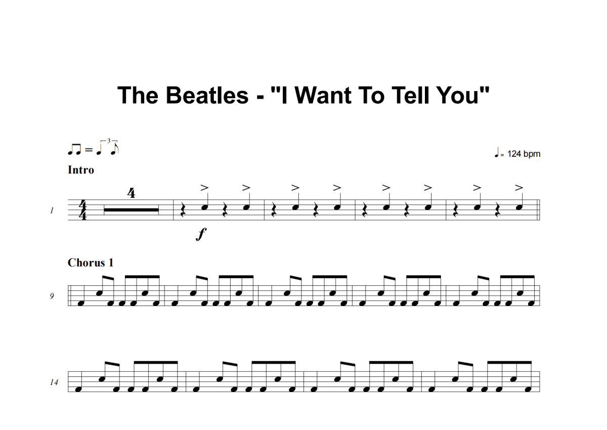 《I Want To Tell You》是The Beatles演唱的一首歌曲,这份架子鼓谱共有两张高清图谱,图谱由 @积极处世 编配上传,图谱使用五线谱编配,使用这份I Want To Tell You架子鼓谱,你将能够轻松地敲打出这首The Beatles的I Want To Tell You,快来尝试吧。