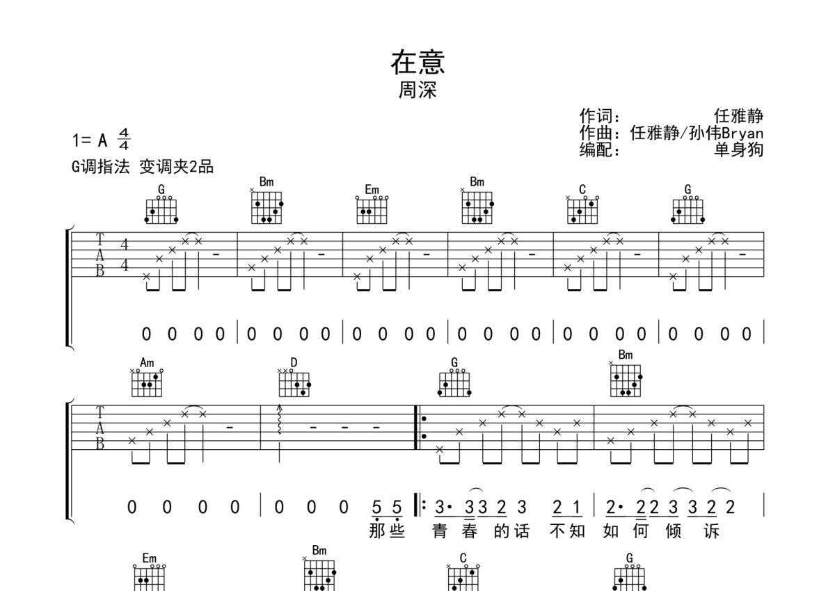 周深《在意》吉他谱 - G调弹唱六线谱
