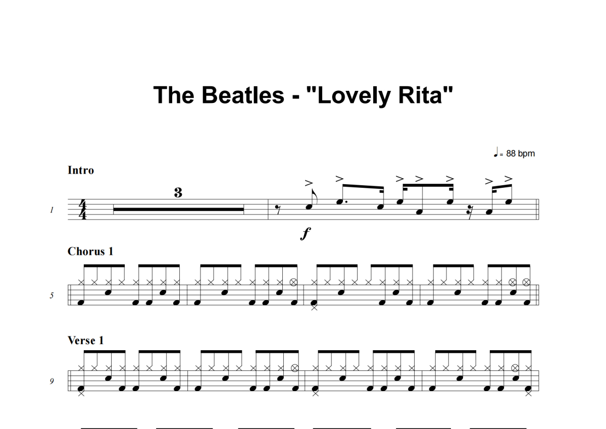 《Lovely Rita》是The Beatles演唱的一首歌曲,这份架子鼓谱共有两张高清图谱,图谱由 @积极处世 编配上传,图谱使用五线谱编配,使用这份Lovely Rita架子鼓谱,你将能够轻松地敲打出这首The Beatles的Lovely Rita,快来尝试吧。