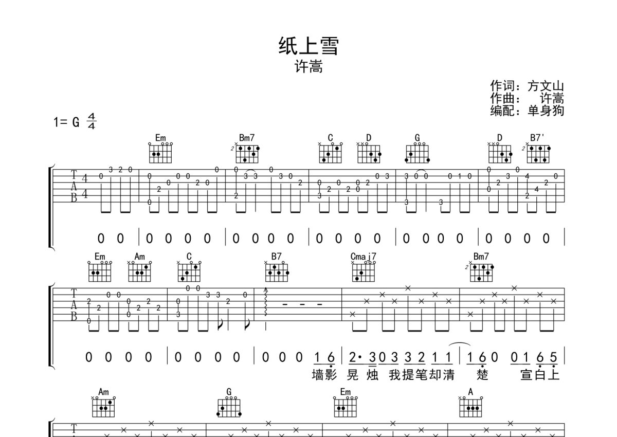 许嵩《纸上雪》吉他谱 - G调弹唱六线谱